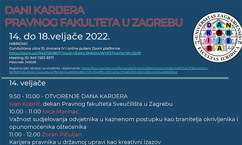Prva tri dana, od ponedjeljka, 14. do srijede, 16. veljače, niz će stručnjaka iz odvjetništva, sudstva, javnoga bilježništva, gospodarstva, državne uprave i socijalnoga rada, održati interaktivna predavanja na kojima će govoriti o prednostima i nedostacima rada u tim sektorima te vještinama koje su potrebne za rad u njima. Zadnja dva dana, 17. i 18. veljače (četvrtak i petak), od 12 do 16 sati, održat će se Career Speed Dating s ukupno 18 poslodavaca iz različitih sektora, u kojima ćete imati prilike izravno, jedan na jedan, razgovarati s pojedinim poslodavcima i možda dogovoriti i buduće zaposlenja. Događanje je organizirano uz podršku udruge “Meritokrat”.