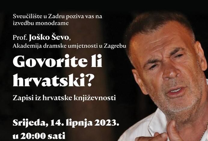 U povodu obilježavanja godišnjice osnutka najstarijeg hrvatskog sveučilišta Universitas Studiorum Jadertina (14. lipnja 1396.) Sveučilište u Zadru poziva na izvedbu monodrame prof. Joška Ševe “Govorite li hrvatski? Zapisi iz hrvatske književnosti”, koja će biti održana u srijedu 14. lipnja, s početkom u 20 sati, u dvorištu restorana Barbakan (Ul. Ruđera Boškovića 5).