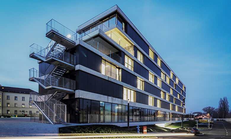 Plastika montažnih betonskih traka dijeli svaki kat i tvori ritam između prozirnih površina stakla i punih tamnih vlaknasto-cementnih ploča. Krovne površine su ravne, dijelom zamišljene kao terase. Zgrada se sastoji od podzemne etaže, prizemlja (studentski prostori, parking za bicikle i ostali servisni prostori) i 5 gornjih etaža (243 sobe sa 600 ležajeva). Projekt je kategoriziran kao A + energetski dizajn, koristeći toplinske pumpe, solarne panele i kišnicu kako bi pokrio svoje potrebe.