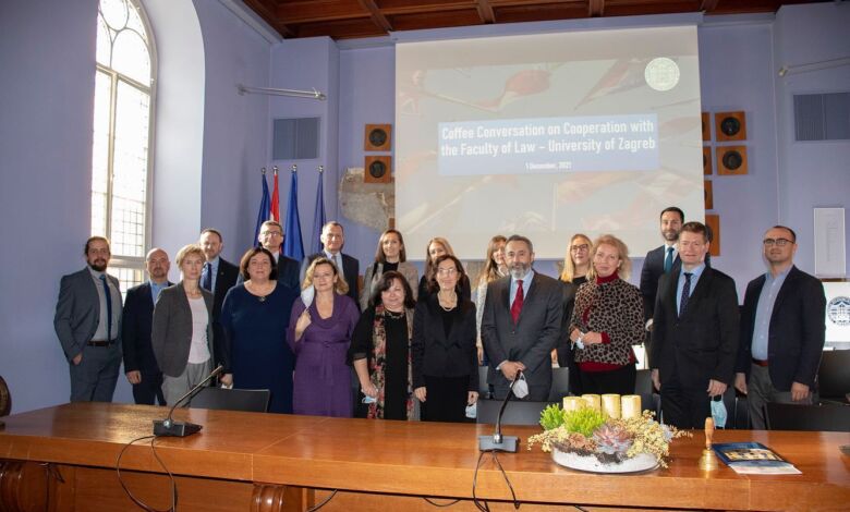 U Auli Sveučilišta u Zagrebu održan je sastanak predstavnika Pravnog fakulteta Sveučilišta u Zagrebu prof. dr. sc. Ivana Koprića i prodekanice za međunarodnu i međuinstitucionalnu suradnju i upravljanje kvalitetom, prof. dr. sc. Iris Goldner Lang s veleposlanicima država članica Europske unije u Republici Hrvatskoj pod nazivom „Coffee Conversation on Cooperation with the Faculty of Law – University of Zagreb“.