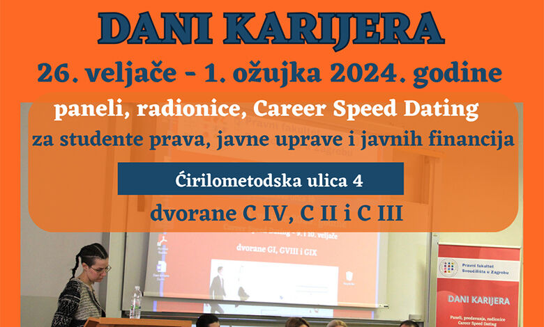 Ovogodišnji Dani karijera, koji će biti održani od 26. veljače do 1. ožujka 2024., otvoreni za studente i diplomante prava, javne uprave i poreznog studija koji su diplomirali u posljednjih godinu dana, približit će studentima zahtjeve i vještine potrebne za specifična područja rada te izazove u radu koje donosi moderna tehnologija rada u našim strukama. Razni paneli i radionice održat će se od 26. do 28. veljače, dok su 29. veljače i 1. ožujka rezervirani za Career Speed Dating – kratke individualne razgovore za posao s poslodavcima u trajanju do deset minuta.