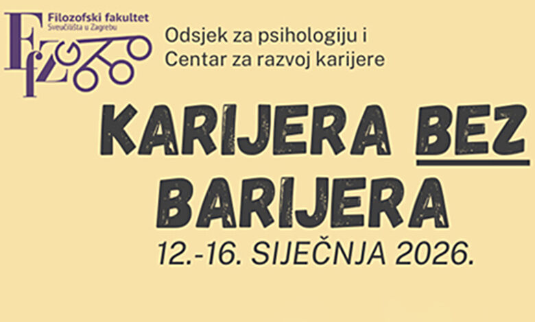 Centar za razvoj karijere u suradnji s Odsjekom za psihologiju Filozofskog fakulteta Sveučilišta u Zagrebu organizira četvrti po redu tjedan karijera „Karijera bez barijera“ – ciklus radionica i individualnih karijernih savjetovanja namijenjenih studentima FFZG-a svih studijskih grupa i razina studija.