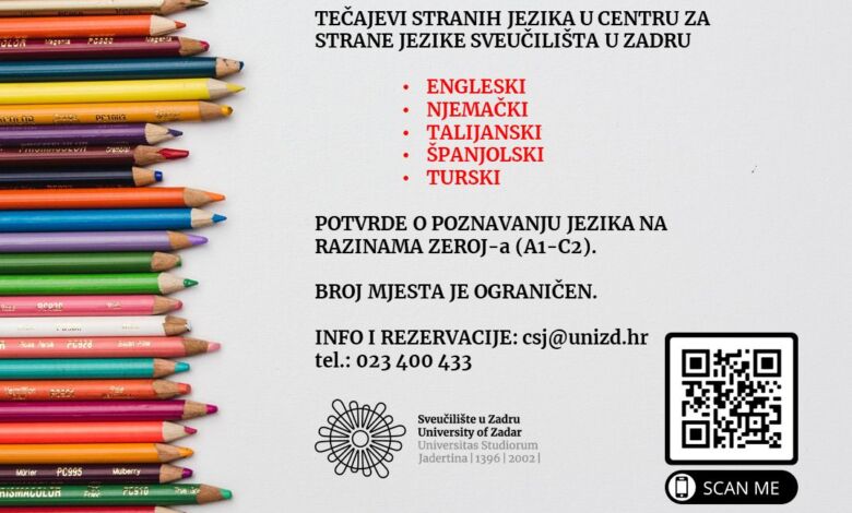 U okviru programa cjeloživotnog učenja, Centar za strane jezike Sveučilišta u Zadru počinje s održavanjem tečajeva za građanstvo engleskog, njemačkog, talijanskog, španjolskog i turskog jezika od A1 do C2 razine.